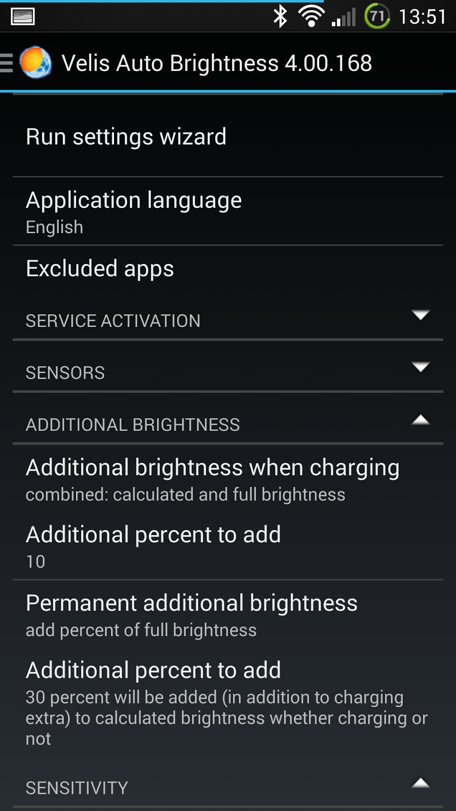 - Sensor sensitivity (afects multiple settings): with this setting you tell the app how responsive it should be to environment light changes. You must carefully balance fast response which may introduce some flicker and slow response that tries provide you with a stably lit screen as much as possible.